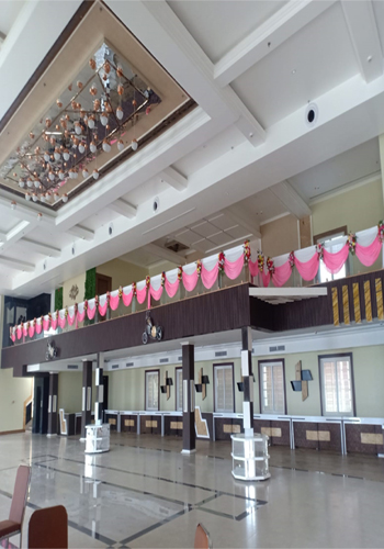 The hall’s sweeping, pillarless architecture provides uninterrupted sightlines and remarkable spatial freedom. This expansive openness allows for grand mandaps, opulent stages, and exquisitely styled themes to come to life with effortless grandeur, ensuring every guest enjoys a clear, immersive view of your event.